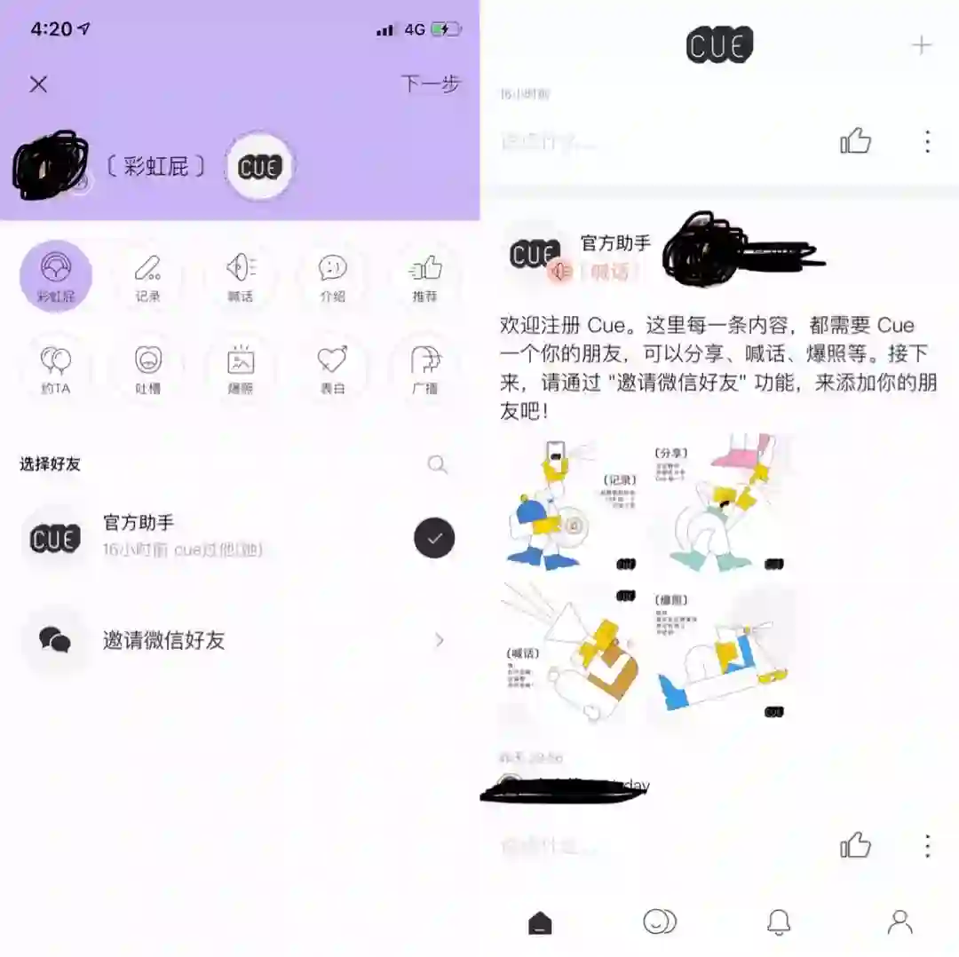 打开App后,会看到slogan“放心晒,都是真朋友”,以及毕加索风格的抽象图画。在Cue社区里,你可以记录日常、吐槽聊八卦、自拍让别人爆照等。与其他产品最大的不同是,Cue发布动态时有10种模式,比如彩虹屁、约TA、吐槽、爆照等。用户选择一种模式时,背景也会变更颜色。除了广播外,用户发布任何一种形态的内容时,必须至少Cue一位朋友,内容才能发布出去。Cue有点类似微信的@功能,可以大大提高朋友互动的效率。