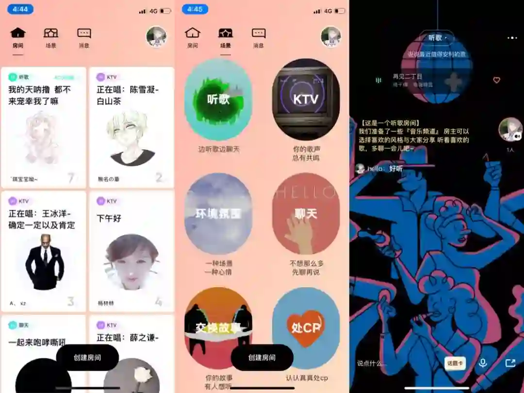 打开App后,会看到房间、场景和消息三个模块。在场景中,又分为听歌、KTV、环境氛围、聊天、交换故事、处CP 6种。用户可以通过App底端的创建房间按钮,选择一种场景创建房间。笔者选择了听歌,便自动创造了一个房间,播放曲目是杨千嬅的《再见二丁目》。用户可以选择隐藏、收起或关闭房间。