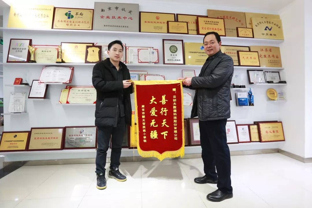 2019年1月10日,南京市朝天宫民族小学向云创大数据赠送了写有“善行天下,大爱无疆”的锦旗,项目申报经理王小聪代表云创接收了锦旗。
