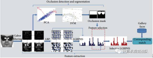在现实生活中,人脸会有部分遮挡(例如眼镜和围巾)的情况,在这种情况下的遮挡,会给人脸检测带来一定的困扰。所以,有提出一个有效的识别方法,由以下三个部分组成。