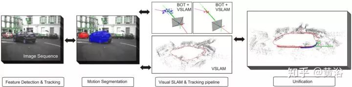 简单示意图如上,其特点:Bearing only Tracking (BOT) 基于particle filter,运动相机做motion segmentation保证静态景物3-D重建。