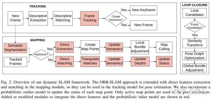 还是在ORB-SLAM2加入深度学习元素,如下图:faster RCNN用于目标检测,目标跟踪结果和feature matching融合。