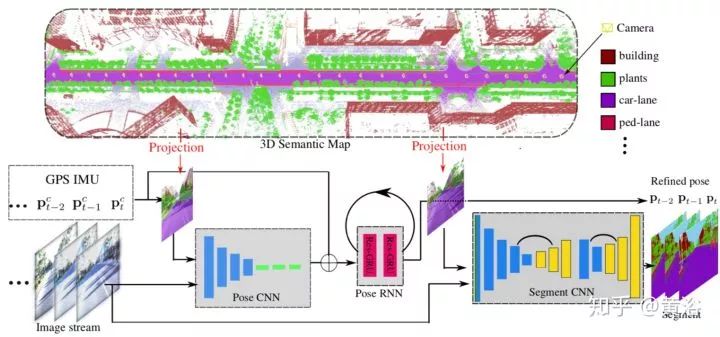 传感器融合的扩展,将GPS/IMU,摄像头和语义地图结合的定位。利用pose CNN做姿态估计,加上multi-layer RNN 做姿态修正。最后和segment CNN 输出的分割结合产生地图信息。