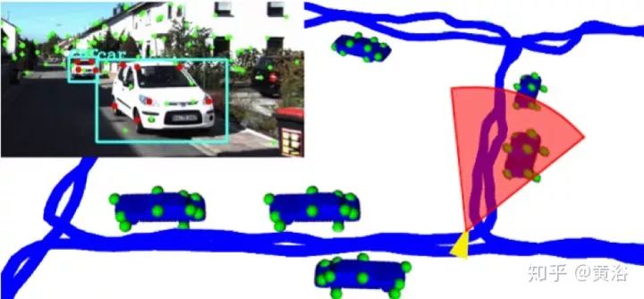 上图展示的是:测量数据包括惯导,几何和语义 (左上角),重建传感器轨迹(蓝色),检测的目标(车),还有估计的车部件 (绿色点,即门和轮子)。