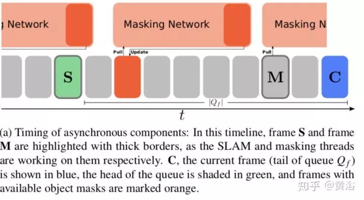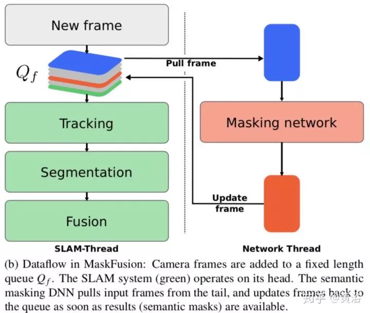 还是CNN的成果介入,提出一个MaskFusion,即RGB-D SLAM的平台。下图展示的MaskFusion后端的数据流: