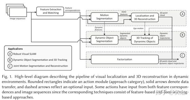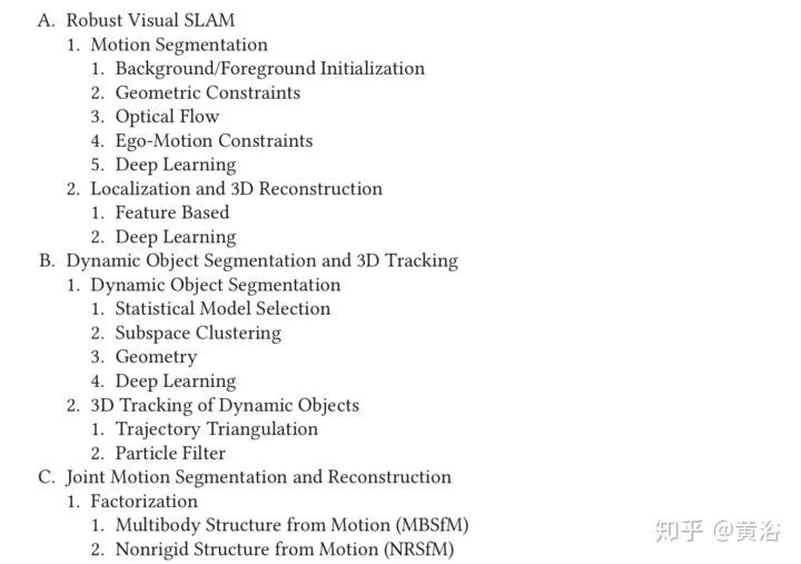 讨论的方法基本分三大类:一定位和重建为主,二动态目标分割和跟踪为主,三运动分割与重建联合估计的方法。
