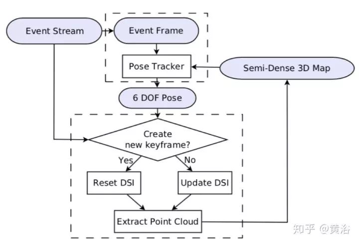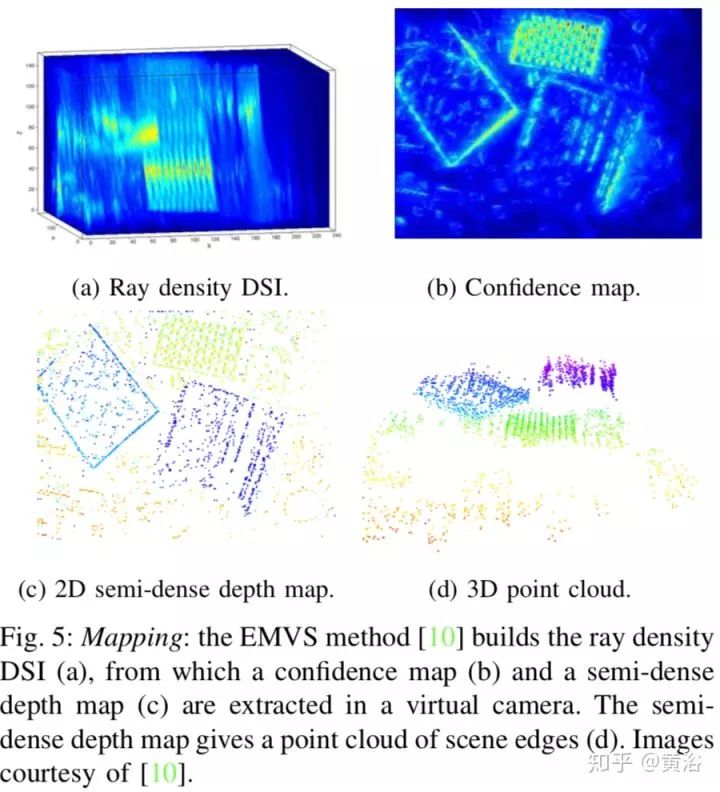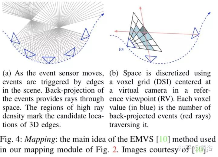 上图为算法流程图。EVO = Event-based Visual Odometry,就是用event cameras (类似Dynamic Vision Sensor)做运动跟踪,上图框架像PTAM。下面两个图是介绍Mapping方法EMVS: