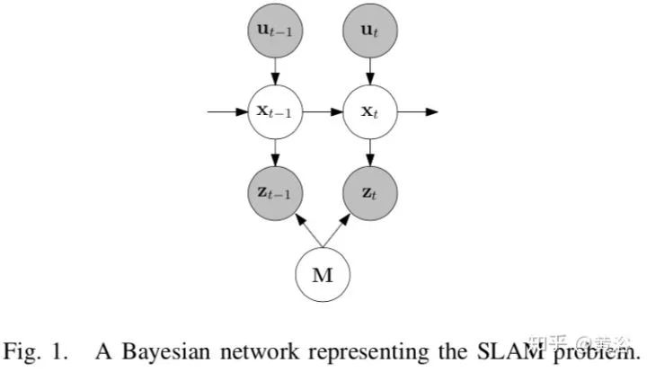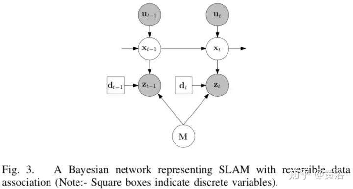 采用广义EM(expectation maximisation)算法处理动态环境下的SLAM,求解的问题定义在一个Bayesian Network框架,如下图:采用sliding window SLAM而不是EKF方法。