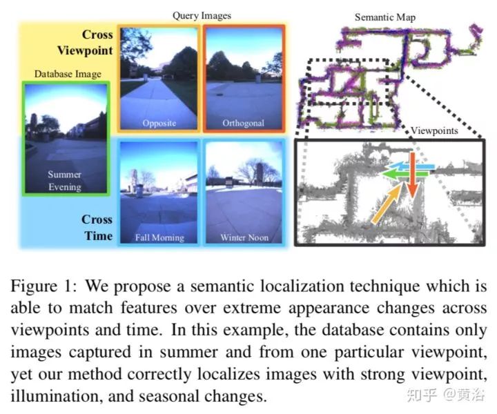 一个语义定位的例子如下图:夏天拍摄的图像放入数据库,在季节变化后从不同的视角拍摄的图像仍然可以成功定位。