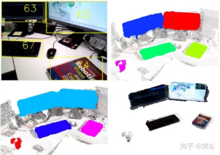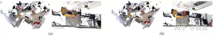下图展示SLAM的结果:(a) 误差累计后不能做闭环; (b) 集成目标检测和语义分割可以做隐形的闭环,改进重建结果。