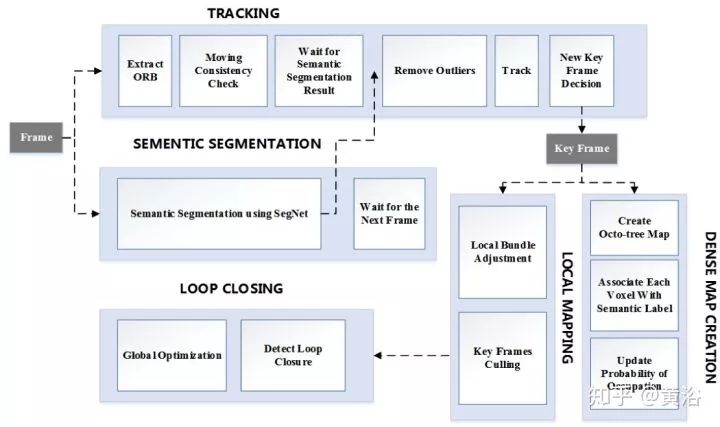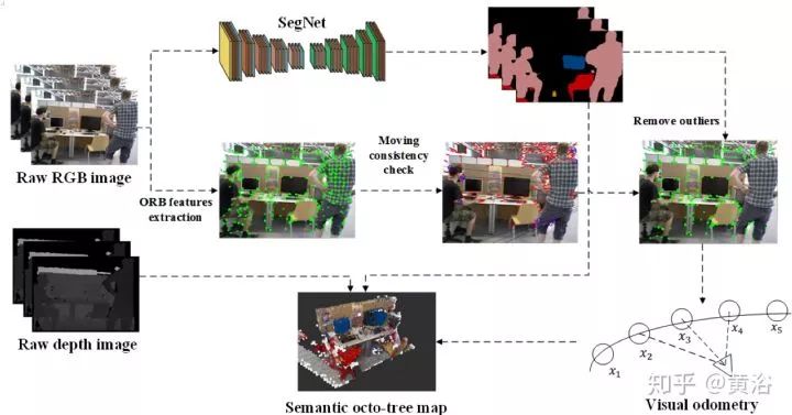 语义分割用SegNet,有深度图的数据可以生成最终Semantic octo-tree map。语义信息和ORB特征检测跟踪结合可以消除运动物体。