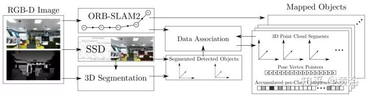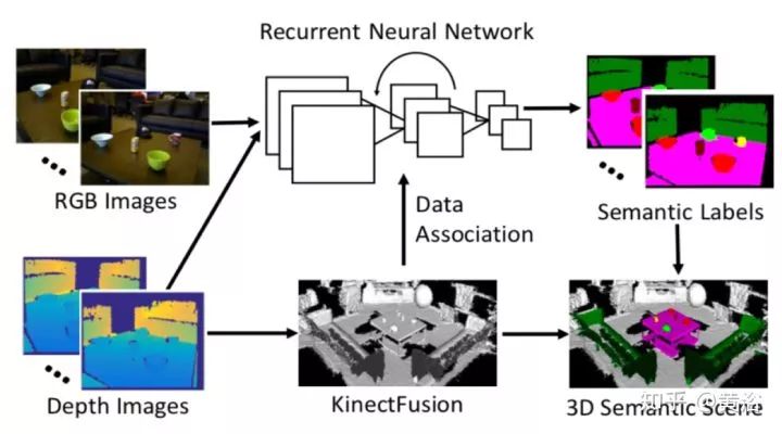 Data Associated Recurrent Neural Networks (DA-RNNs)是产生语义标记的,采用RGB-D传感器,SLAM是一个如KinectFusion的平台。算法框架如下图: