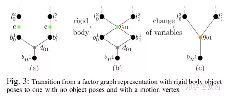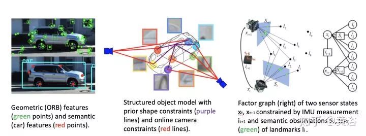 上图有特征和语义特征的比较,带有约束的结构化目标模型和被传感器观测数据(landmarks的IMU和语义)的状态向量factor graph表示。