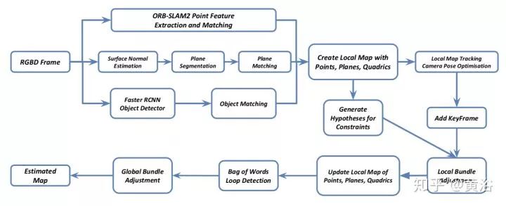 如下图包括5部分:segment extraction, description, localization, map reconstruction, 和 semantics extraction。