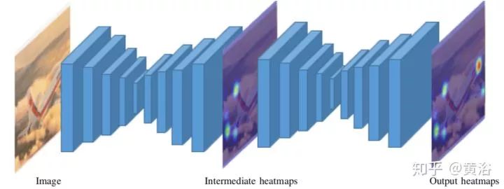 其中CNN模型如下结构:两个沙漏模型的叠加,输出特征点的热图(heatmap)。