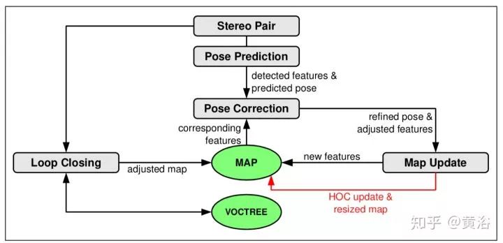 下图是SLAM框架:双目视觉,关键在地图更新环部分。