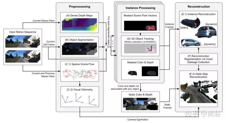双目视觉输入,做深度图估计和物体分割,结合sparse scene flow,对场景进行重建。下图是系统框图: