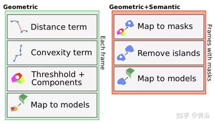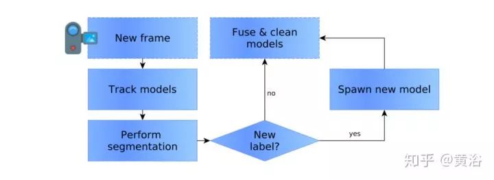 起初系统只有一个目标模型:active的背景模型。跟踪(pose tracking),分割(包括运动分割和图像分割),然后是融合得到新模型。运动分割基于CRF方法,图像分割基于深度学习模型SharpMask,而融合基于surfel模型(ElasticFusion)。