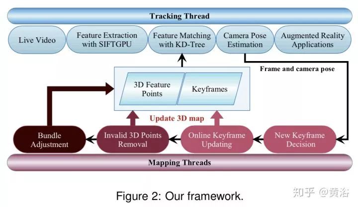 该Monocular SLAM可以处理缓慢变化的动态环境,是一种在线keyframe方法,能够检测变化并及时更新地图。另外,提出一个prior-based adaptive RANSAC (PARSAC) 算法去除outlier。系统框架如下图: