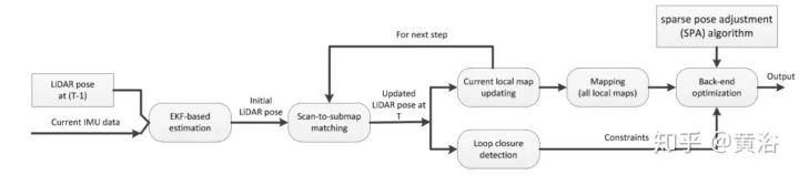 前端部分,在卡尔曼滤波extended Kalman Filter (EKF)下融合IMU传感器和2D LiDAR的2-DSLAM处理低纹理动态环境,scan matching通过LM(Levenberg–Marquardt )算法优化。在后端,做sparse pose adjustment (SPA) 。如下图: