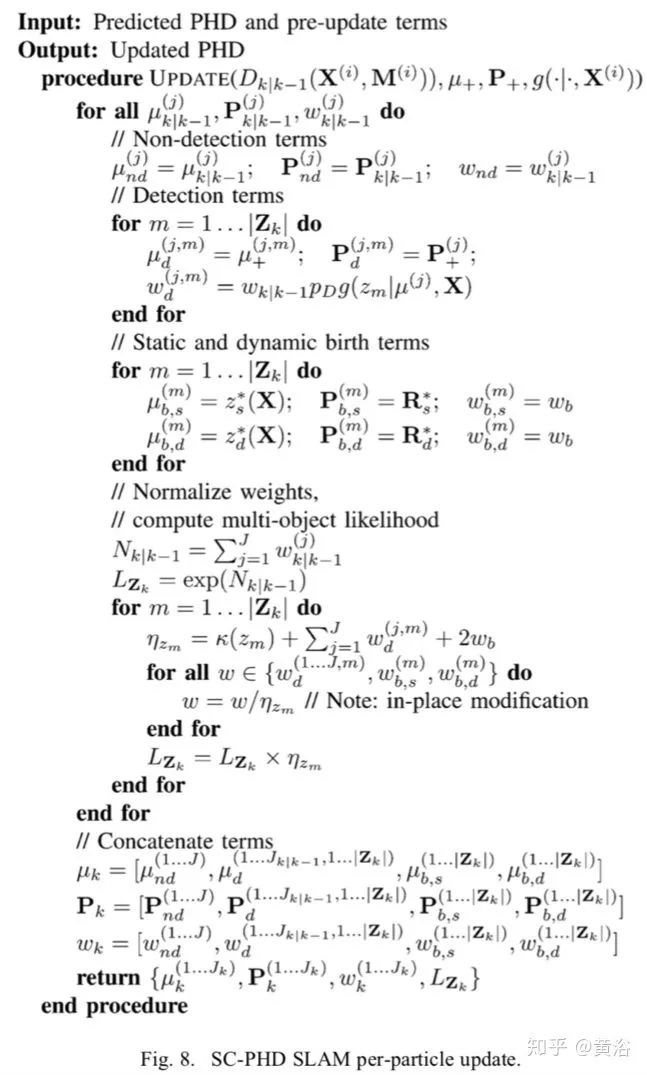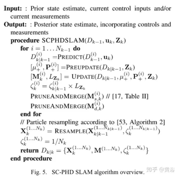 算法核心是particle/Gaussian mixture,single- cluster process是指feature-based SLAM,其中车辆运动是主,而特征运动为附。下面是四个算法的概略: