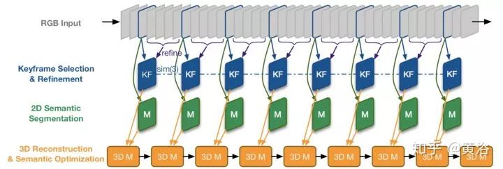 下面是一个算法流程图,包括三个进程:Keyframe selection, 2D semantic segmentation, 和3D reconstruction with semantic optimization。