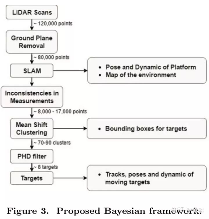 如上面框图所示,特点:采用occupancy grid maps,因为传感器是激光雷达,可以采用ICP算法定位,地面估计去除在先,Mean Shift做聚类得到目标检测,Probability Hypothesis Density (PHD) 做多目标跟踪。