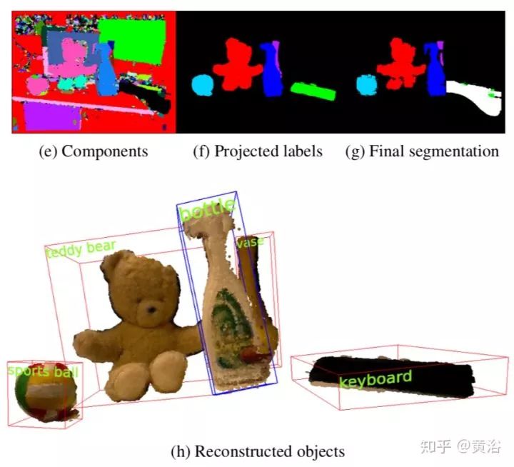 下图是分割方法的拆解:(a) RGB (b) depth, (c)-(g) 各个步骤时候的结果.