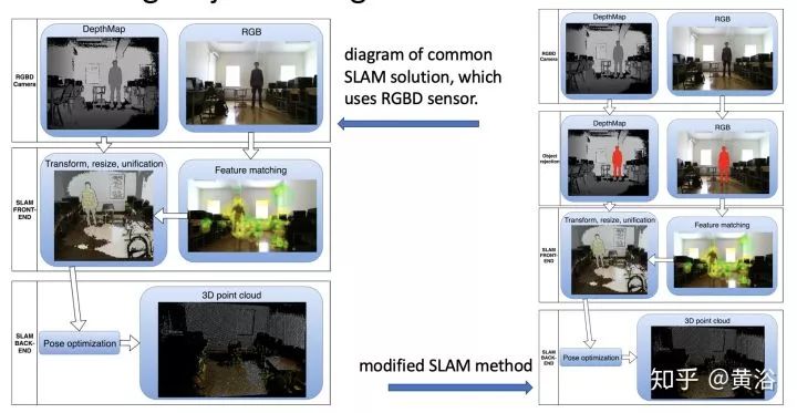 采用Kinect深度传感器,见上图,和一般SLAM比较,比较容易检测出运动目标(室内深度层次少)。