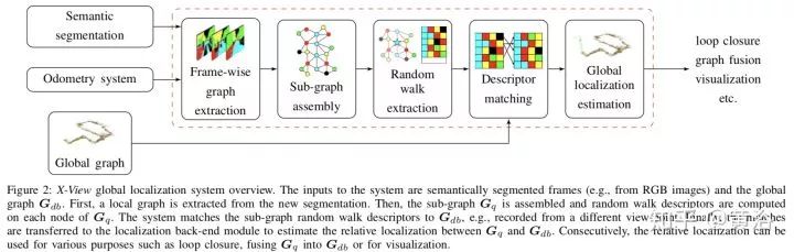 X-View是基于图的多视角定位,其中语义图描述子,vertex descriptor,是定位的关键。每个图的节点,会提取random walk描述子,在下一步匹配定位时候用。下面就是它的系统框图:
