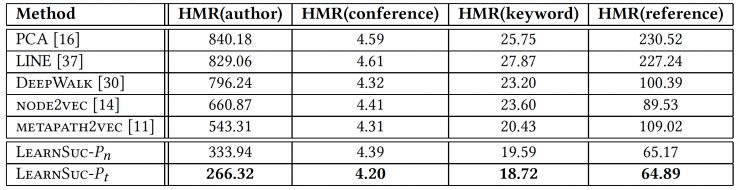 表征学习的方法为我们提供了一些较好的思路:如果我们能够学习到论文以及其包含的上下文项的向量表征的话,我们关心的预测以及推荐问题将会迎刃而解。值得提到的是近两年比较流行网络嵌入学习。这些方法基于保存节点与节点之间邻近度的思路,能够将网中的节点快速地学习成向量表征。当拥有了节点的向量表征之后,我们能够轻易地利用向量內积来运算出节点与节点之间的相似度,从而帮我们完成节点分类与边预测等任务。但网络嵌入学习的方法并不能适用于我们的情况:我们关心的是由一组由多类型上下文项构成的论文是否能够在未来成功发表,而不是该篇论文是否和某一个作者在网中有较高的相似度。