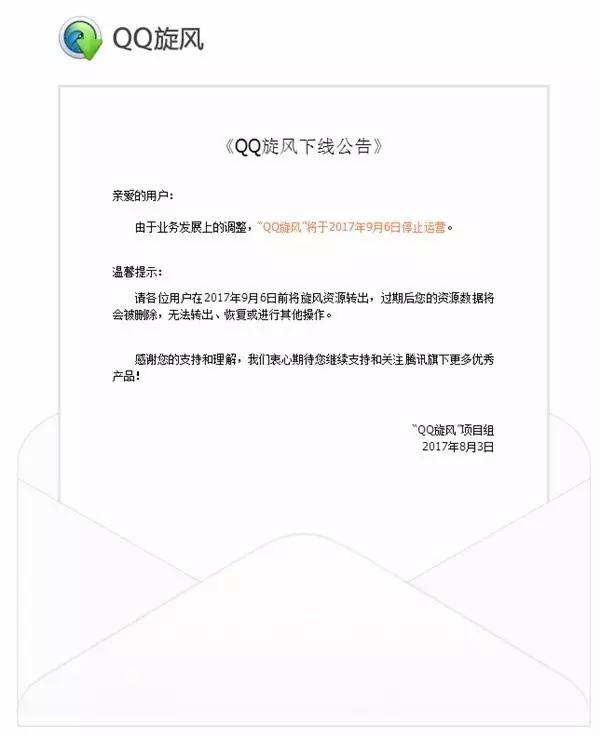 QQ旋风官方表示,请各位用户在9月6日前将旋风资源转出,过期后资源数据将会被删除,无法转出、恢复或进行其它操作。