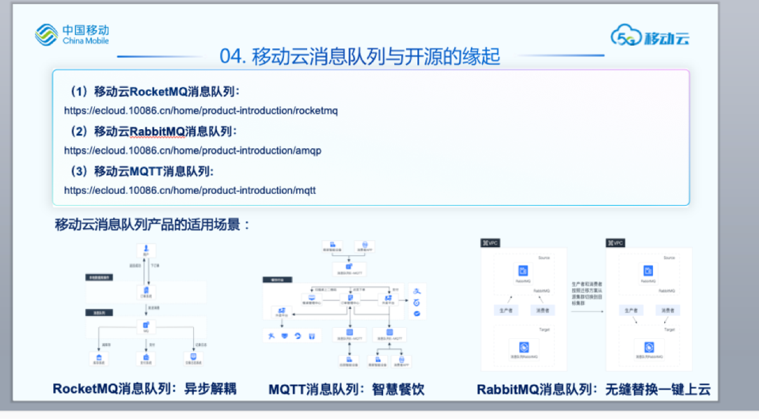 最后,想跟大家介绍一下移动云消息队列产品线。移动云RocketMQ/MQTT/RabbitMQ消息队列本身具备云端多租户隔离和物理隔离,具备像API计量统计,支持多种协议的核心能力。这三款消息队列主要针对云端场景,比如高性能、高可靠、高SLA和灵活部署特性,同时支持丰富的高级功能特性,像消息轨迹、资源统计报表、定时延迟消息等,作为消息队列的基础通信云服务。目前移动云消息队列的产品线,在中国移动公有云,IT云生产环境和各个私有云项目中得到了广泛的实践和应用。