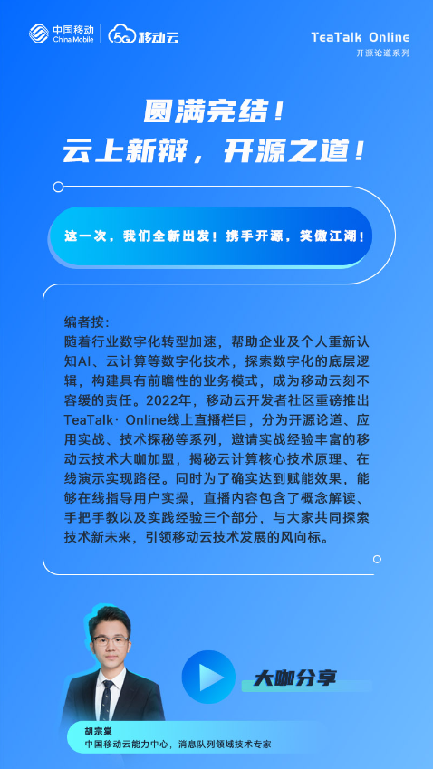 以下为中国移动云能力中心,消息队列领域技术专家胡宗棠老师演讲实录。