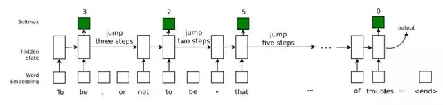 具体说来,文章是希望在LSTM的基础上加入“跳转”功能,从而使得这个时序模型能够有能力判读是否要略过一部分文字信息。简单说来,作者们是这么对LSTM进行改进的。首先,有一个参数R来确定要读多少文字。然后模型从一个0到K的基于Multinomial分布的这一个跳转机制中决定当前需要往后跳多少文字(可以是0,也就是说不跳转)。这个是否跳转的这一个步骤所需要的Multinomial分布,则也要基于当期LSTM的隐参数信息(Hidden State)。跳转决定以后,根据这个跳转信息,模型会看一下是否已经达到最大的跳转限制N。如果没有则往后跳转。当所有的这些步骤都走完,达到一个序列(往往是一个句子)结尾的时候,最后的隐参数信息会用来对最终需要的目标(比如分类标签)进行预测。