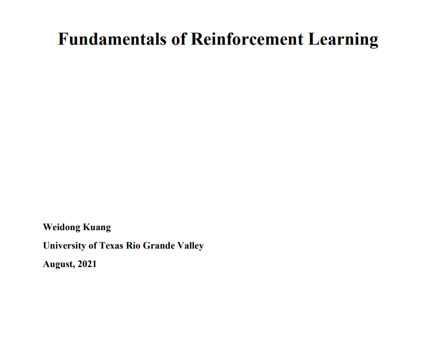 这本手稿涵盖了强化学习的所有重要的基本方面。第二章采用马尔可夫决策过程对主体与环境之间的相互作用进行建模。第三章介绍了基于给定环境模型解决MDP问题的核心技术——动态规划。一般来说,解决MDP问题涉及到政策评估和政策改进的迭代。在第四章中,我们讨论了无模型方法:蒙特卡洛,TD学习,SARSA和q学习。第五章对强化学习中的值函数逼近进行了一般讨论。作为一个重要的例子,深度Q-learning将在第6章中详细介绍。第7章介绍了策略梯度方法,重点介绍了策略梯度定理、REINFORCE算法、Advantage Actor-Critic算法等基本概念。