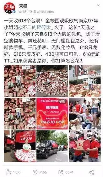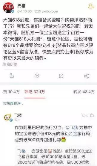 在今年618,天猫成功套用了类似的营销模式。在618前一天,天猫发布微博,宣布将从转发微博的用户中赠送一份“天猫618大礼包”,并提示会有商家在评论区留言送礼。在618的活动中,天猫就已经开始采用“锦鲤”的概念,最终获得了48.4万的转发量。