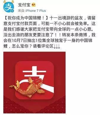 9月29日,支付宝官微发了一条“祝你成为中国锦鲤”的微博,称将在10月7日抽取转发这条微博的一名粉丝为“中国锦鲤”,领取一份超级大礼包。