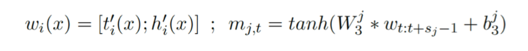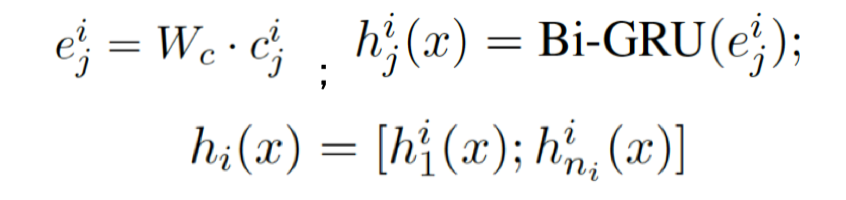 我们将整个输入序列看成字符序列,词之间使用一个空字符隔开。将每个字符映射成一个固定大小的embedding后,使用Bi-GRU构建每一个字符的表示,然后将每个词的首尾字符的表示拼接作为每个词对应的表示,对应公式如下: