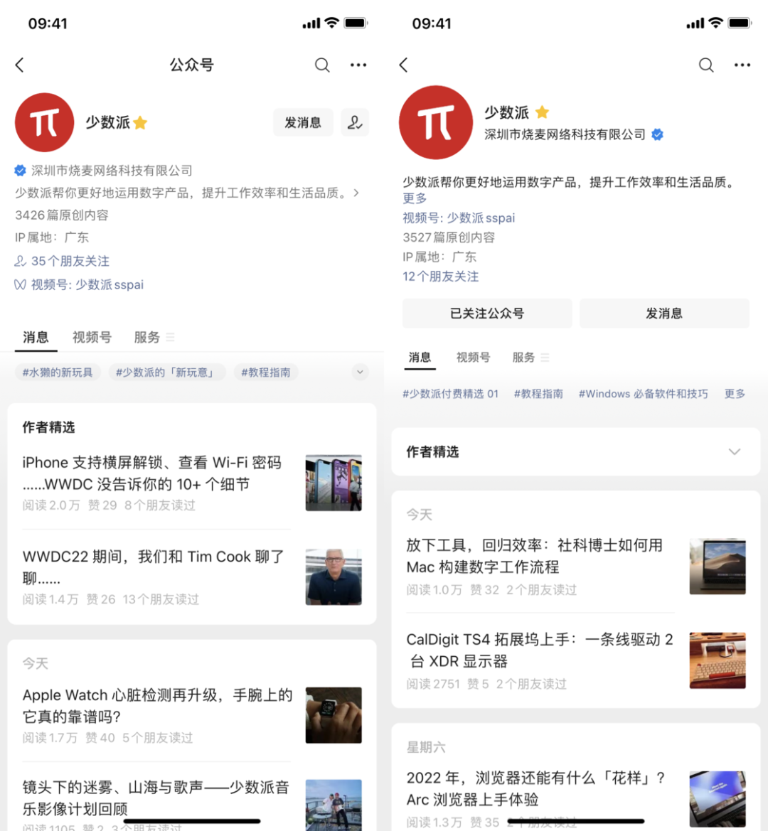 公众号详情页 UI 调整,将「发消息」与「关注」按钮放大;