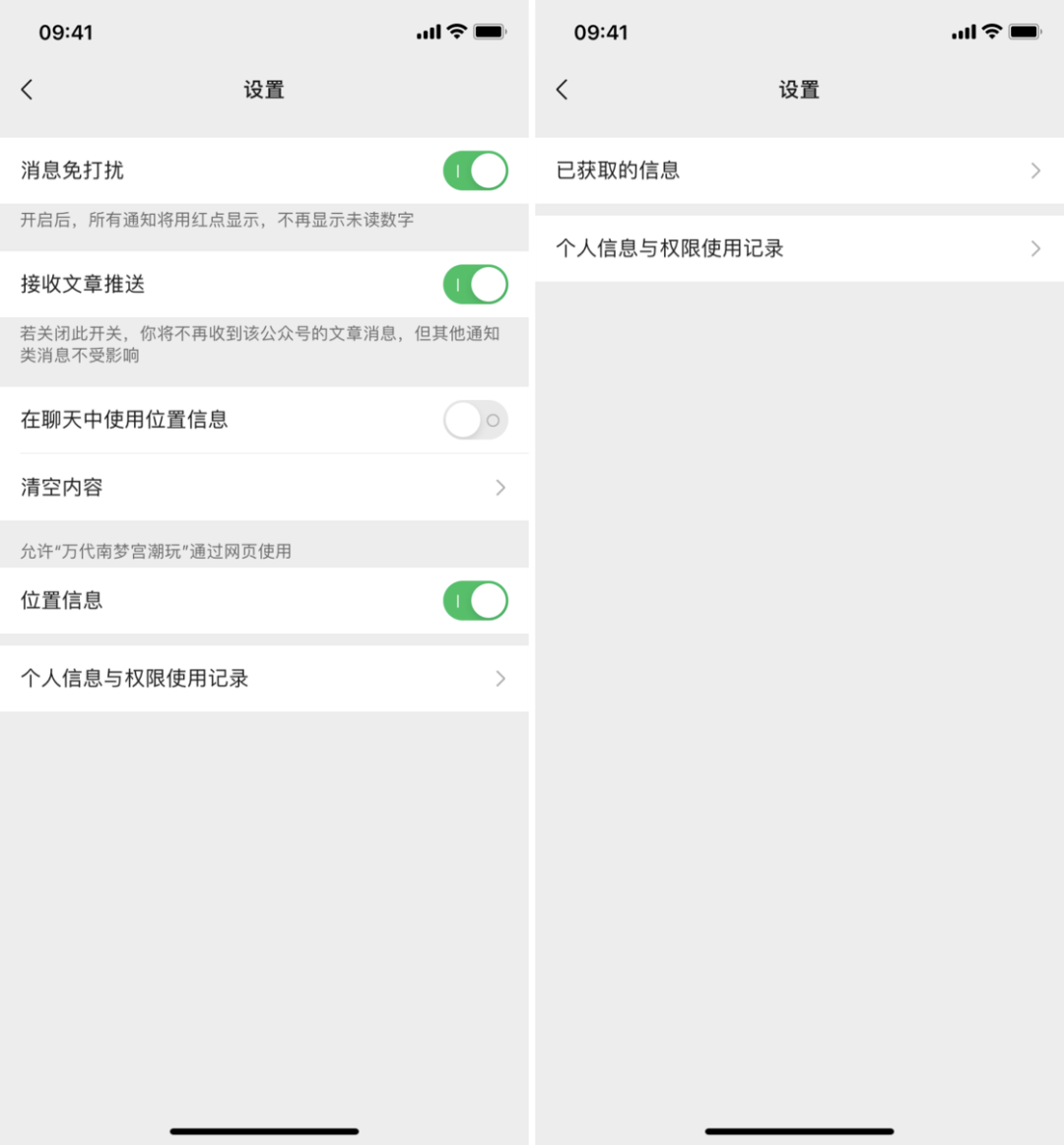 值得一提的是,如果你点击的是小程序,那么只会看到「已获取的信息」和「个人信息与权限使用记录」两个菜单。但如果你选择的是公众号,还能看到消息免打扰、接收文章推送等开关,方便你一步到位地解决权限管理问题。