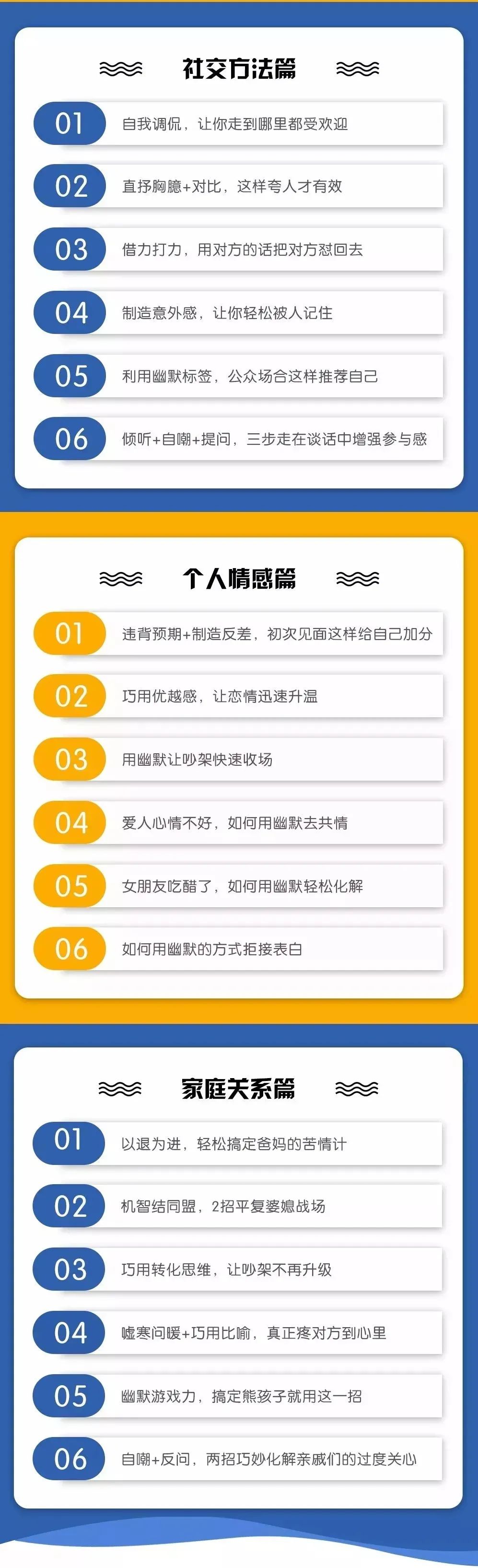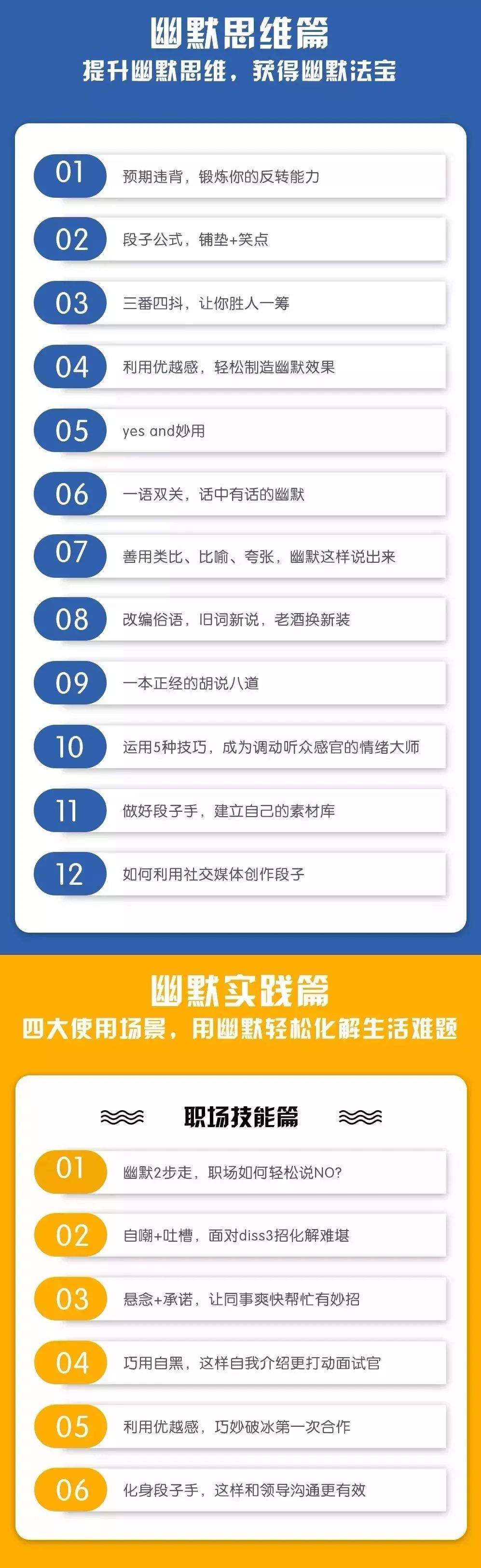 课程分为幽默思维和幽默实践两部分,内容涉及职场技能、社交方法、个人情感、家庭关系等诸多方面。