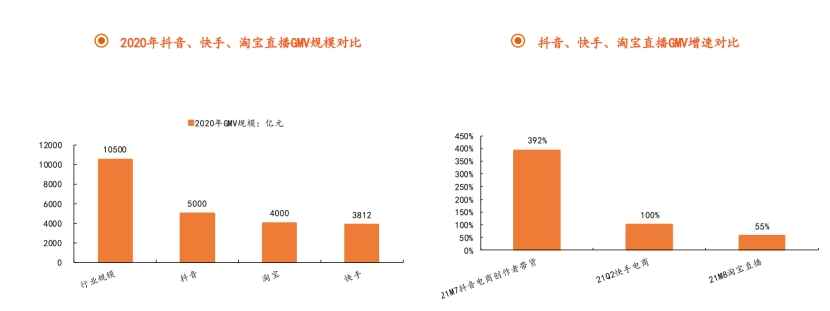 根据研报显示,从2020年全年GMV看,淘宝直播电商GMV达4000亿,抖音直播电商GMV在5000亿左右,快手直播电商GMV达到3812亿。