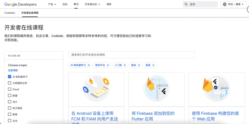 Google 开发者在线课程持续更新,帮助开发者不断拓展知识技能,满足不断变化的开发需求。在线课程覆盖 10+ Google 产品或服务,包含 130+ 个在线课程,200+ 个引导式编程练习 (Codelabs) ,帮助开发者快速掌握技术知识与技能。