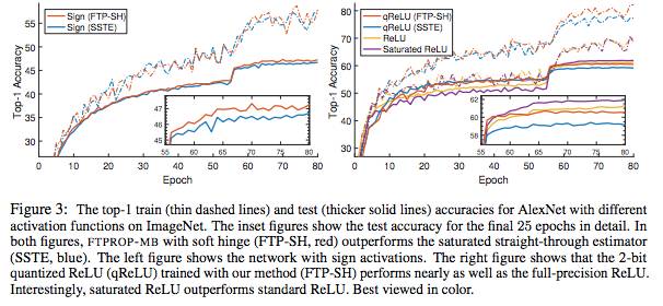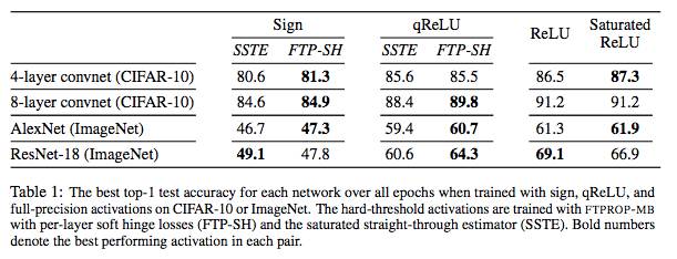 在此框架下,我们开发了一种递归算法,我们称之为 feasible target propagatio(FTPROP),用于学习deep hard-threshold network。由于这是一个离散优化问题,我们开发了基于每层损失函数设置目标的启发式方法。 FTPROP的mini-batch版本可以用来解释和证明 straight-through estimator(Hinton, 2012; Bengio et al., 2013),它可以被看作是FTPROP 的一个特例,对于每层损失函数和目标启发式具有特定的选择。最后,我们开发了一种新的损失函数,它可以改善deep hard-threshold network的学习。在实验中,我们证明与STE相比,FTPROP-MB提高了CIFAR-10和ImageNet的多个模型的分类精度(上图)。