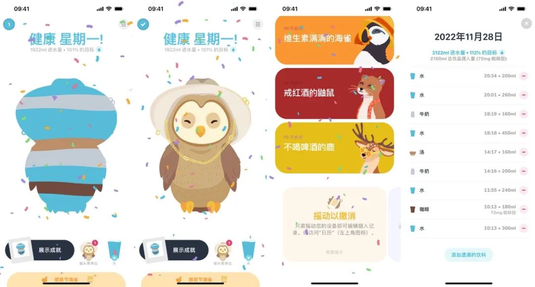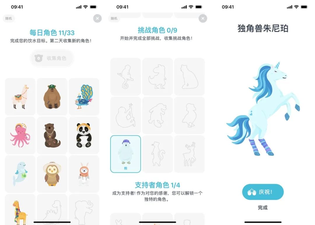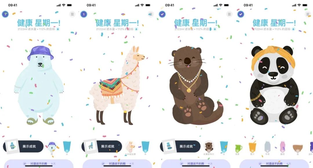 喝水羊驼便通过设计不同的动物形象,同时融入健康饮水相关的挑战打造了一套同样富有创意的激励系统。喝水羊驼设置了 33 个每日角色、9 个挑战角色和 4 个支持者角色,同时我们还可以通过完成应用推出的限时挑战来获取一些更加独特的角色。每日角色只能随着我们每天坚持饮水来解锁,当完成新的饮水记录或是解锁不同的饮品种类,乃至发现应用的独特功能时,喝水羊驼都会奖励我们对应的角色。