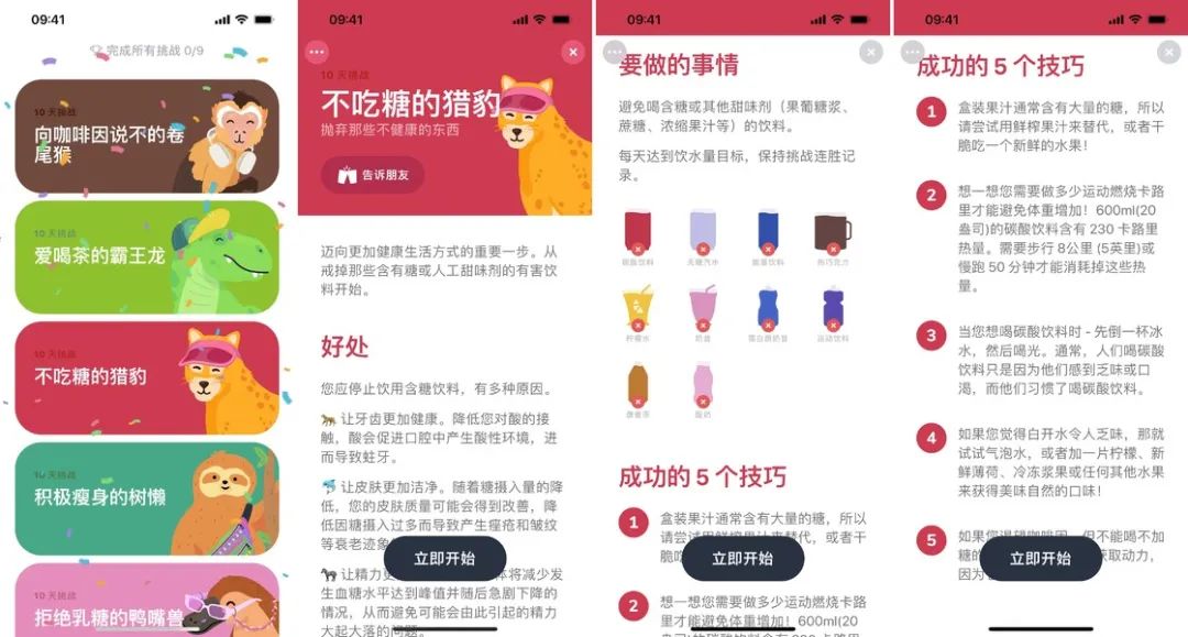 而挑战角色的获取则需要一定的门槛,喝水羊驼内置了 9 个创意挑战,只有接受对应的挑战并完成后才能获取角色,并且挑战的完成有一定的难度,譬如我们每次只能完成一项挑战,且如果当天饮水量没有达到目标则挑战也会随之中断。总之,喝水羊驼试图通过这类设定激发我们收集欲望的同时也鼓励我们健康饮水,喝水羊驼的挑战设定并非简单地一笔带过,而是通过不同的挑战类型普及饮水相关的知识,并提出有效促进饮水的建议。