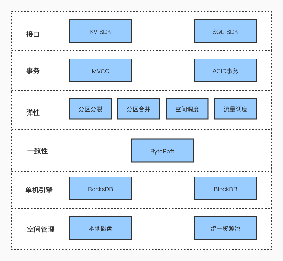 一致性协议层通过自研的 ByteRaft 组件,保证数据的强一致性,并且提供多种部署方案,适应不同的资源分布情况。
