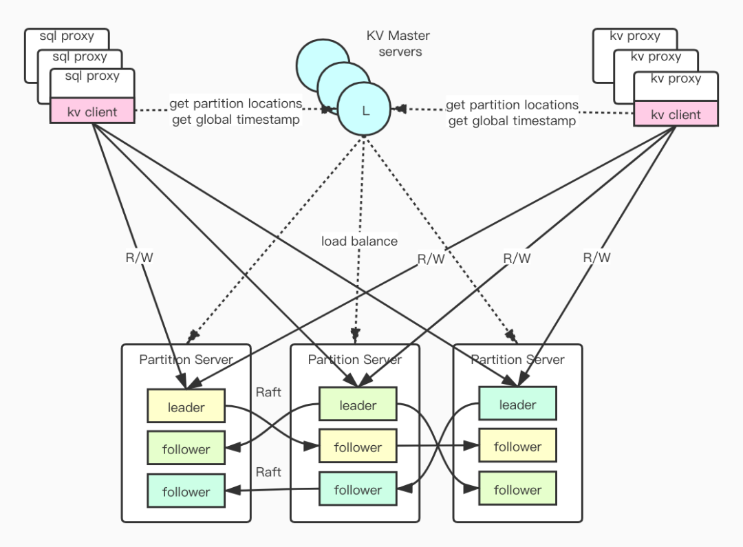 集群中数据会按照 range 切分为很多 Partition,每个 Partition 有多个副本,副本之间通过 Raft 来保证一致性。这些副本分布在所有的 PartitionServer 中,每个 PartitionServer 会存储多个 Partition 的副本,KVMaster 负责把所有副本均匀的放置在各个 PartitionServer 中。各个 PartitionServer 会定期汇报自身存储的副本的信息给 KVMaster,从而 KVMaster 有全局的副本位置信息。Proxy 接到 SDK 请求后,会访问 KVMaster 拿到副本位置信息,然后将请求路由到具体的 PartitionServer,同时 Proxy 会缓存一部分副本位置信息以便于后续快速访问。由于副本会在 PartitionServer 之间调度,故 Proxy 缓存的信息可能是过期的,这时当 PartitionServer 给 Proxy 回应副本位置已经变更后,Proxy 会重新向 KVMaster 请求副本位置信息。