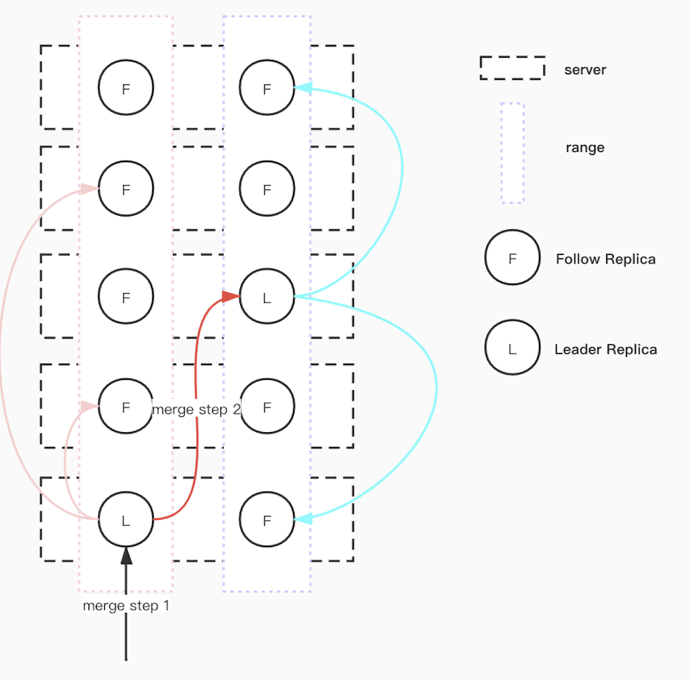 合并的过程比分裂复杂,master 将待合并的两个相邻区间调度到一块,然后发起一次合并操作。如上图所示,这个过程分为两步:首先左区间发起一次操作,拿到一个同步点,然后在右区间发起合并操作;右区间会进行等待,只要当前 Server 中左区间同步点前的数据都同步完成,就能够安全地修改左右区间的元信息,完成合并操作。